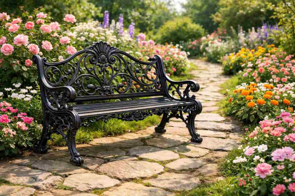 Os bancos de ferro fundido são clássicos e costumam ter detalhes ornamentais, como arabescos ou curvas elegantes. São resistentes e transmitem uma sensação de sofisticação.