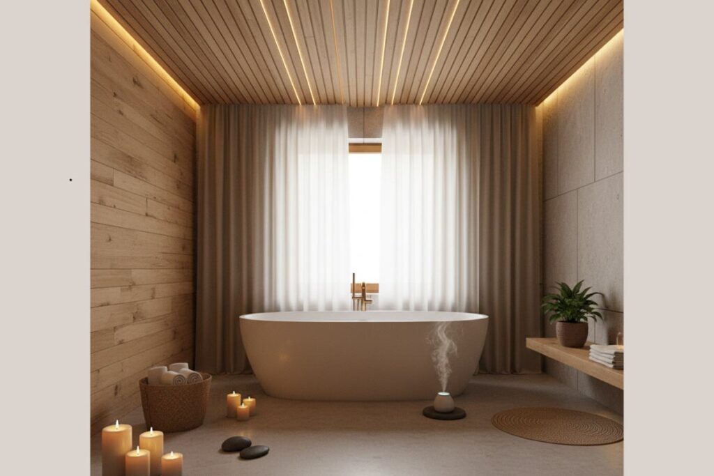 Banheiros com teto de madeira, banheira central e iluminação quente criam uma experiência parecida com a de um spa. Aposte em velas, essências e materiais naturais para completar o clima de relaxamento.