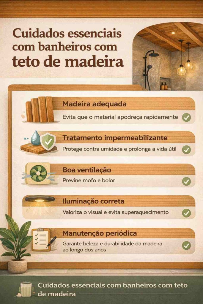 Este infográfico reúne os cuidados essenciais com banheiros com teto de madeira, ajudando a preservar a beleza, evitar danos e manter o ambiente sempre bonito e funcional.