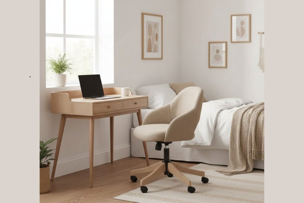 Para quem trabalha no quarto, o ideal é optar por cadeiras compactas e confortáveis. As de estilo escandinavo ou com base em madeira são uma boa escolha, pois unem conforto e beleza.