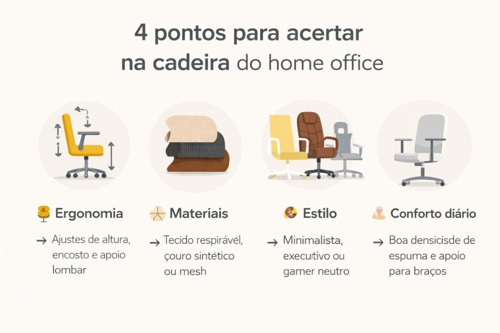 A escolha do material não deve ser apenas estética. Couro prioriza elegância, tela favorece ventilação e tecido equilibra conforto e design. O ideal é alinhar o revestimento à sua rotina de trabalho e às condições do ambiente.