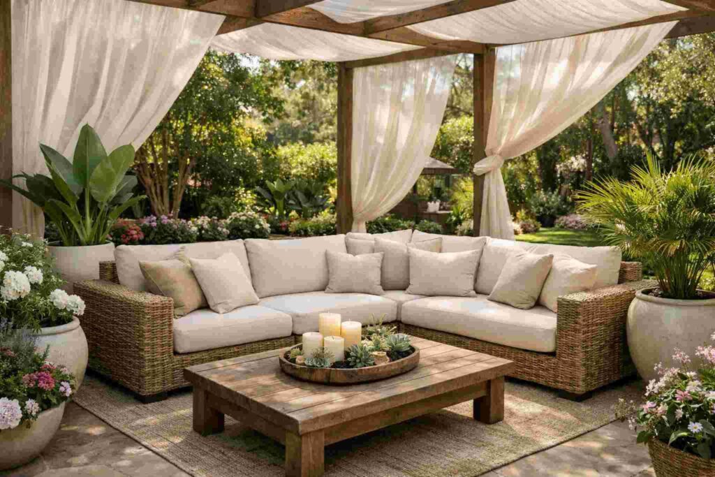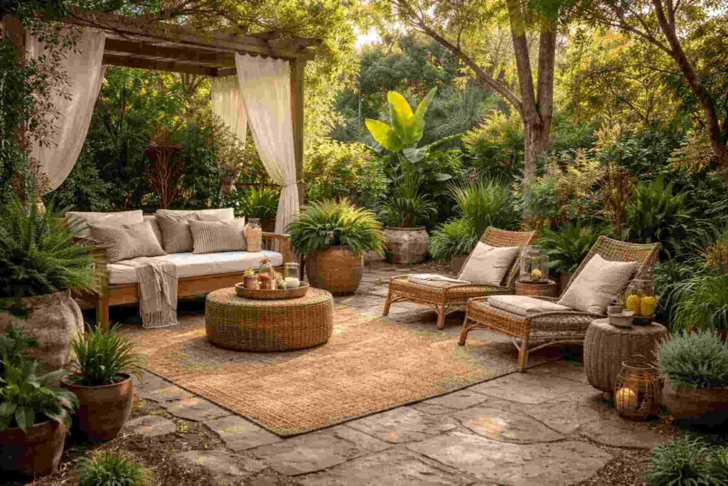 Em quintais maiores, o refúgio natural pode assumir um papel social. O sofá de fibra natural com estofados neutros oferece conforto e resistência, além de se integrar bem ao ambiente externo. Tons claros ajudam a manter a sensação de leveza.