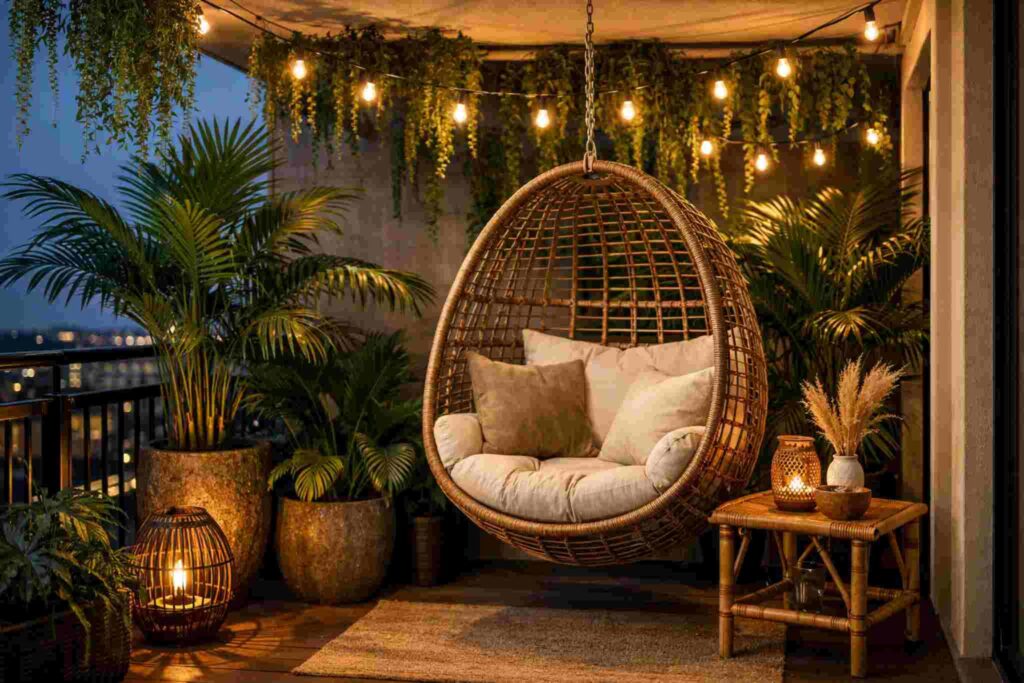 A cadeira suspensa tipo “egg chair” funciona como peça central do ambiente. Além de confortável, ela cria um ponto de relaxamento visual e físico, ideal para descanso ou leitura. As almofadas reforçam o conforto e podem trazer cores suaves ou naturais.