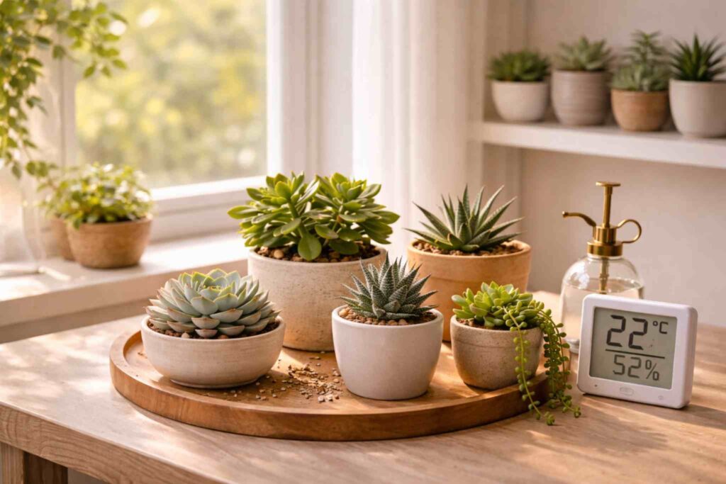Iluminação adequada e temperatura estável são essenciais para o desenvolvimento saudável das suculentas