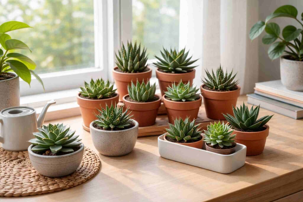 Escolha espécies que gostam de meia-sombra, como Haworthia e Gasteria. Coloque os vasos próximos a janelas bem iluminadas. Evite locais com ar-condicionado direto ou calor excessivo.