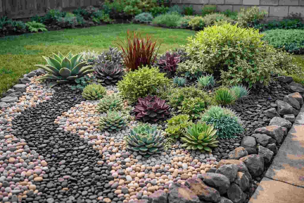 No quintal, monte um canteiro com pedras decorativas. Misture espécies de cores diferentes e coloque pedriscos entre elas. Isso ajuda na drenagem e dá um visual elegante.
