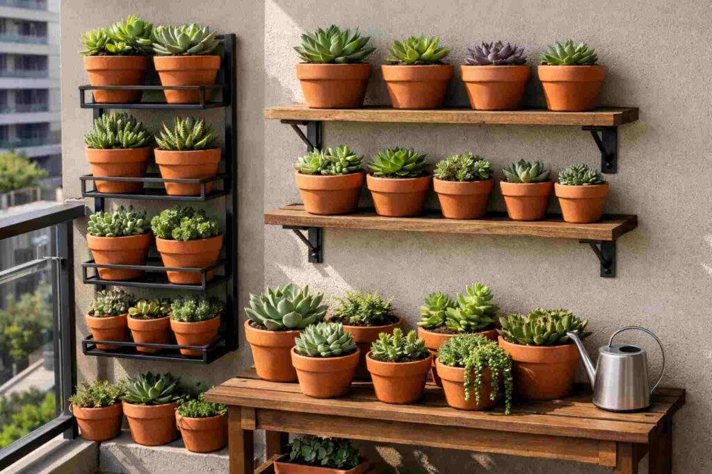 Se você mora em apartamento, pode cultivar suculentas em vasos pequenos na sacada. Use suportes verticais e vasos de barro. Regue uma vez por semana e observe a exposição solar.
