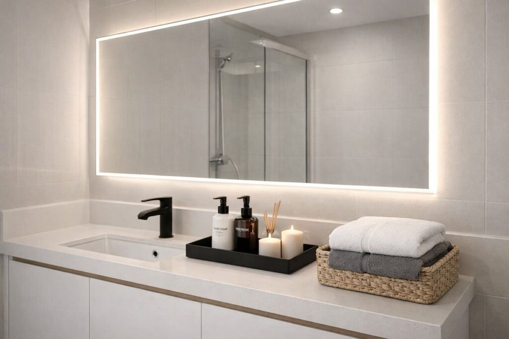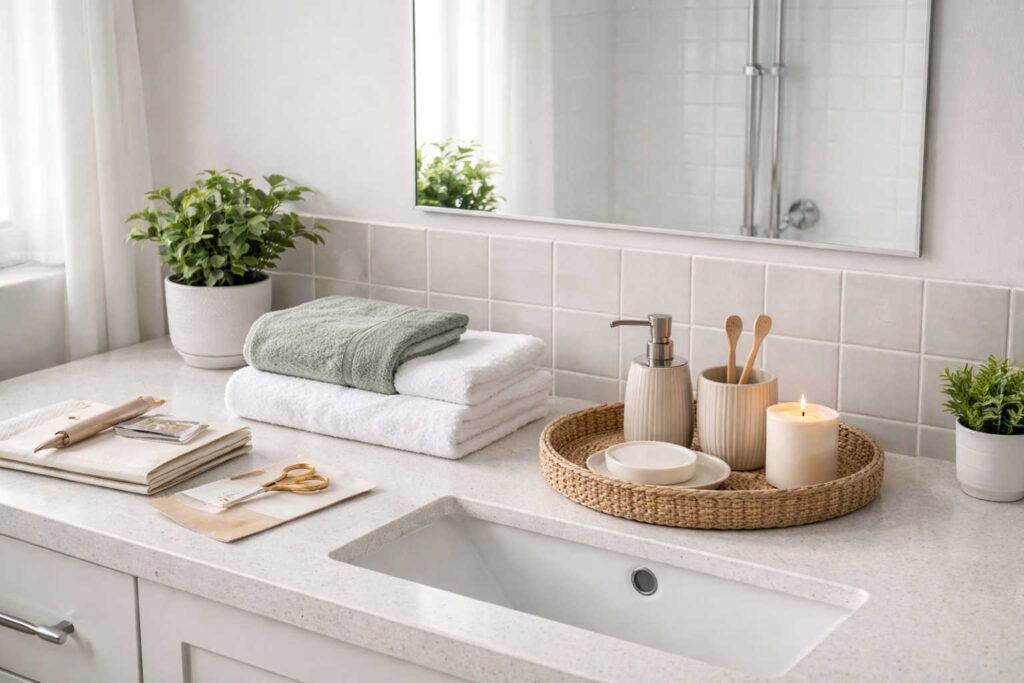 A bandeja organizadora concentra poucos itens essenciais, evitando poluição visual. Toalhas lisas dobradas sobre o cesto e velas decorativas completam o espaço com sofisticação, mostrando que é possível decorar com estilo sem exageros.