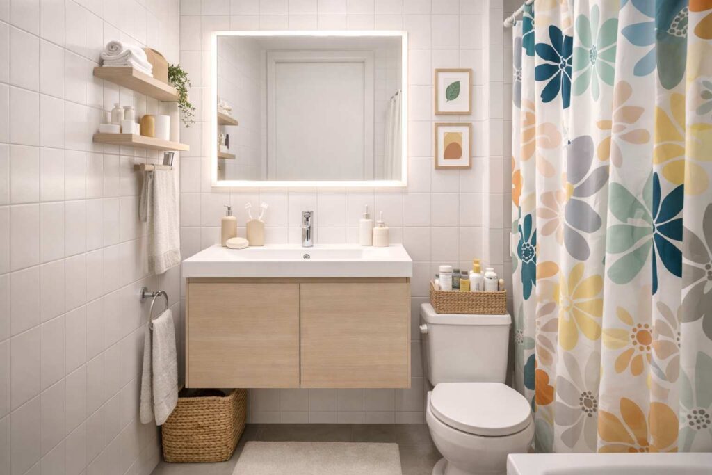Tapetes, cortinas de box, capas para vasos sanitários e acessórios autoadesivos transformam o banheiro sem reformas. Esses itens são fáceis de instalar, econômicos e ideais para quem mora de aluguel.