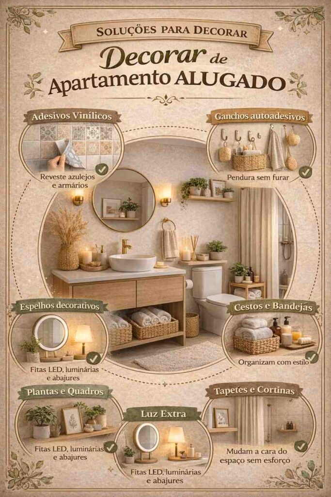 Neste infográfico, você confere soluções para decorar banheiro de apartamento alugado de forma prática e acessível, com ideias que valorizam o espaço, respeitam o contrato de aluguel e facilitam o dia a dia.