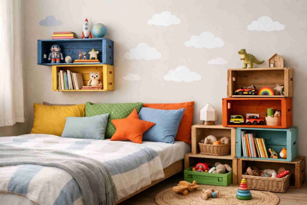Reaproveite caixotes de feira pintados para criar estantes ou nichos. Combine com adesivos de parede de nuvens e faça uma cabeceira com almofadas coloridas. Resultado: um quarto com cara de revista gastando menos de R$ 300.