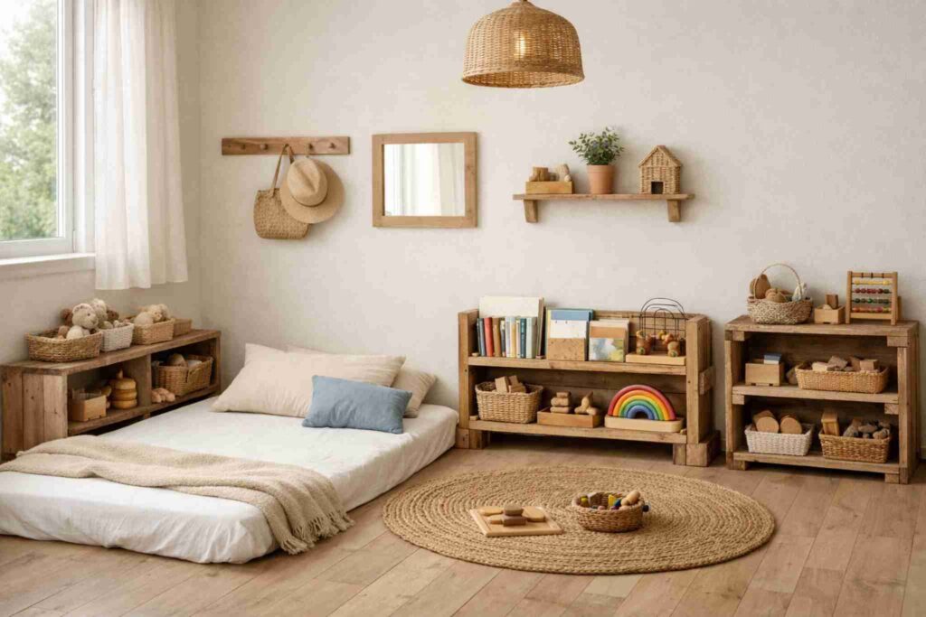 Use um colchão no chão, estantes baixas feitas com madeira reaproveitada e objetos ao alcance da criança. Crie um ambiente funcional e educativo, gastando pouco e com foco no desenvolvimento infantil.
