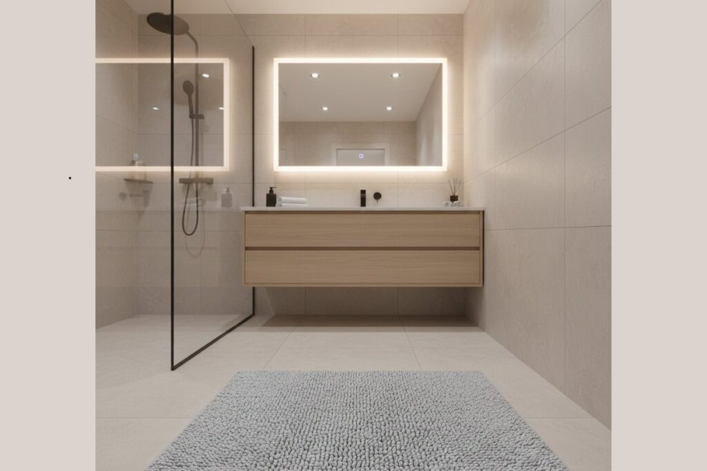 - Banheiro minimalista: tapetes em tons neutros, como branco, bege ou cinza.