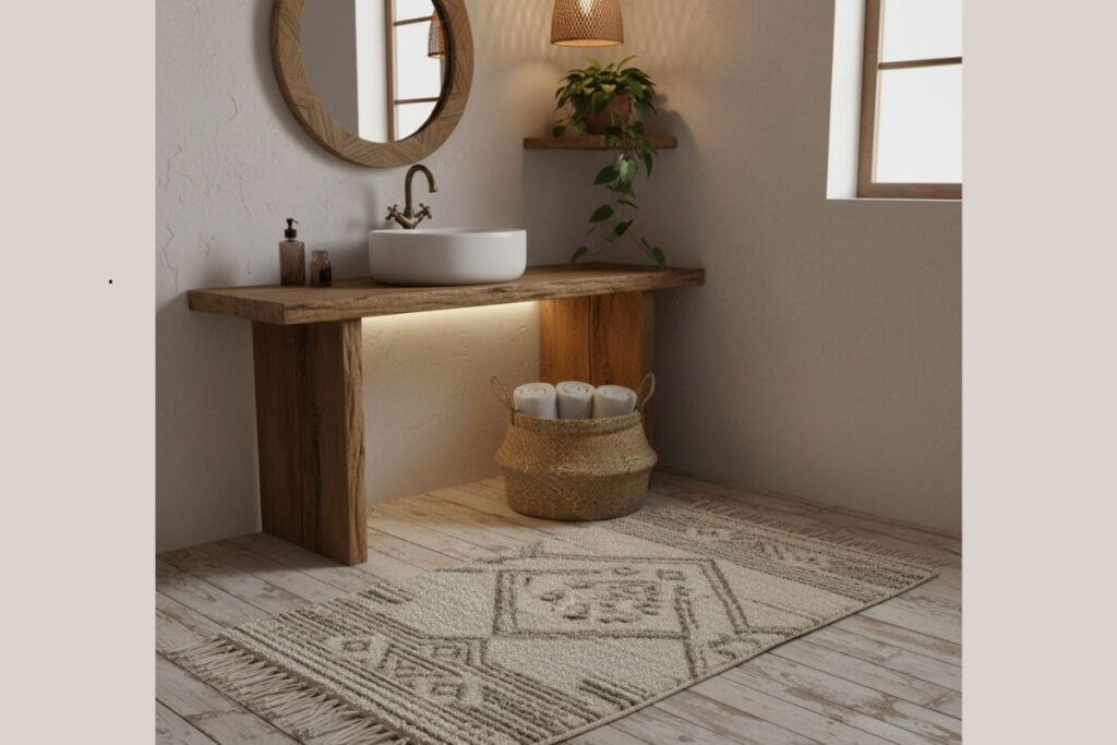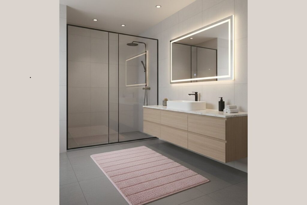 - Banheiro moderno: tapetes com design geométrico ou cor sólida vibrante.