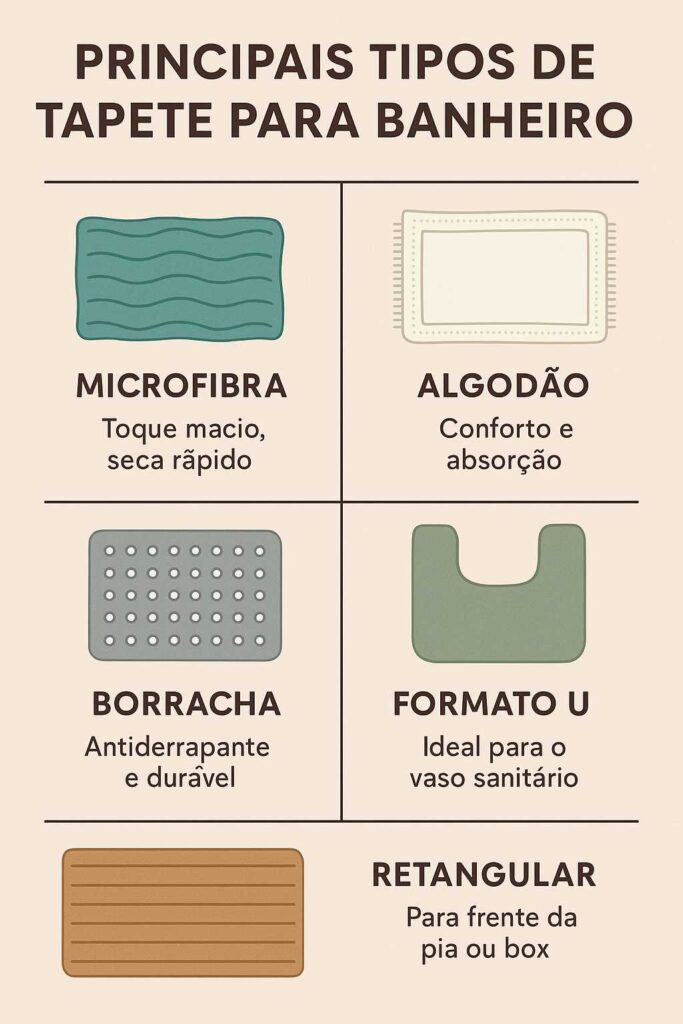 Os tapetes são essenciais para trazer conforto, segurança e charme ao banheiro. No infográfico abaixo, você confere os principais tipos disponíveis e descobre qual deles combina melhor com o seu estilo e necessidade.