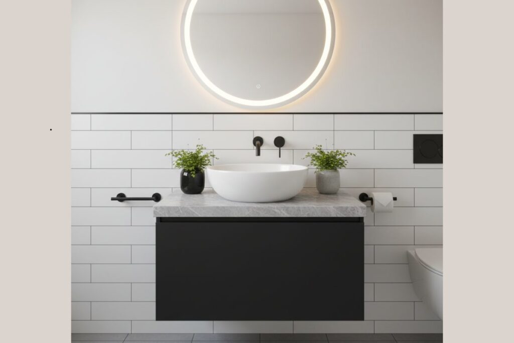Em banheiros, especialmente os menores, a regra é destacar sem exagerar, garantindo harmonia e funcionalidade.