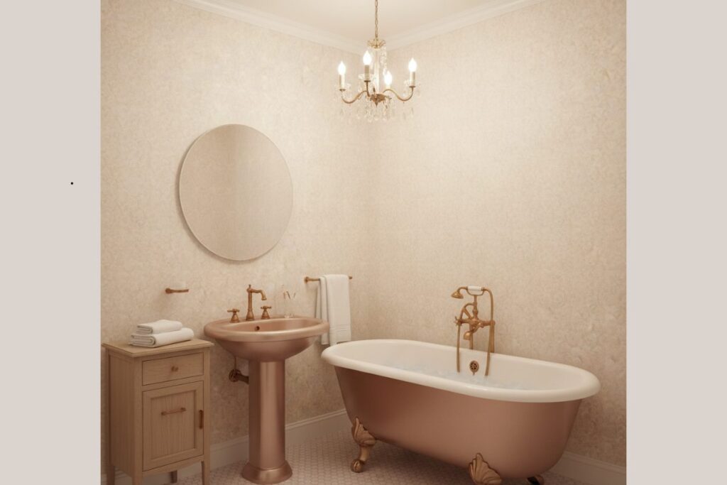 O lustre pequeno pendente adiciona um ar clássico e elegante, funcionando como elemento decorativo e fonte de luz. Já a banheira com pés dourados se torna a peça central do banheiro, reforçando o toque romântico e sofisticado da proposta.