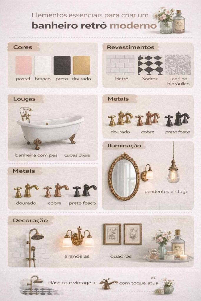 Este infográfico reúne os elementos essenciais para criar um banheiro retrô moderno, ajudando a compor um ambiente equilibrado, elegante e cheio de personalidade.