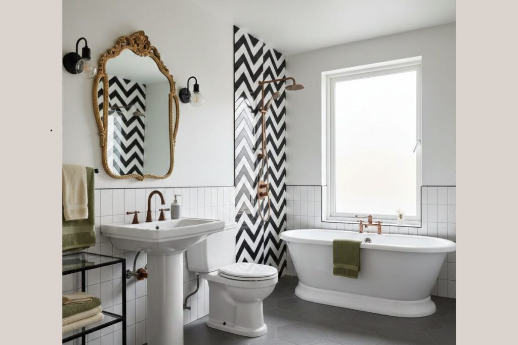 Desenhos geométricos, xadrez ou formas orgânicas ganham um ar moderno quando usados em paletas mais suaves ou contemporâneas. Assim, o banheiro mantém a identidade retrô com um visual atualizado.