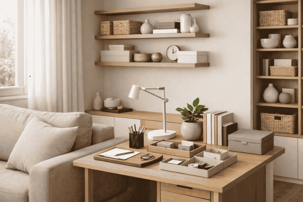 Em espaços reduzidos, a bagunça aparece mais rápido. Cestos, bandejas e caixas organizadoras ajudam a manter documentos e acessórios sempre no lugar.