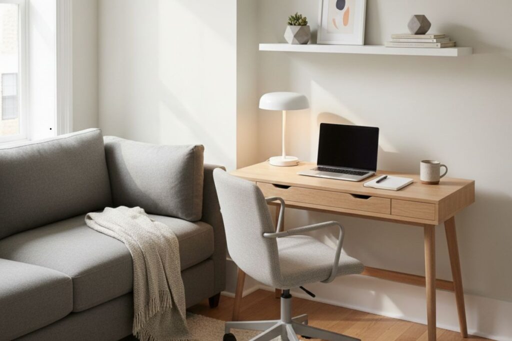 Criar um cantinho de trabalho na sala não significa perder o conforto do ambiente. O segredo está em manter o espaço organizado e escolher móveis que combinem com a decoração existente.