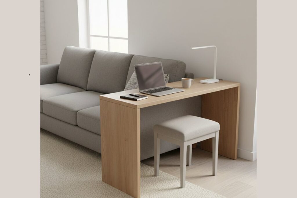 Estação de trabalho ao lado do sofá otimiza a sala e cria um ponto funcional para o dia a dia