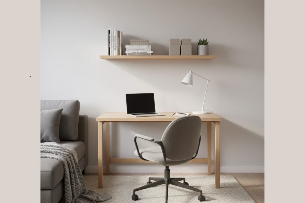 Uma solução simples é usar prateleiras, nichos ou mesas estreitas, que ocupam pouco espaço e ajudam a organizar materiais do dia a dia. Esses elementos aproveitam a área vertical da parede e deixam o ambiente mais funcional.