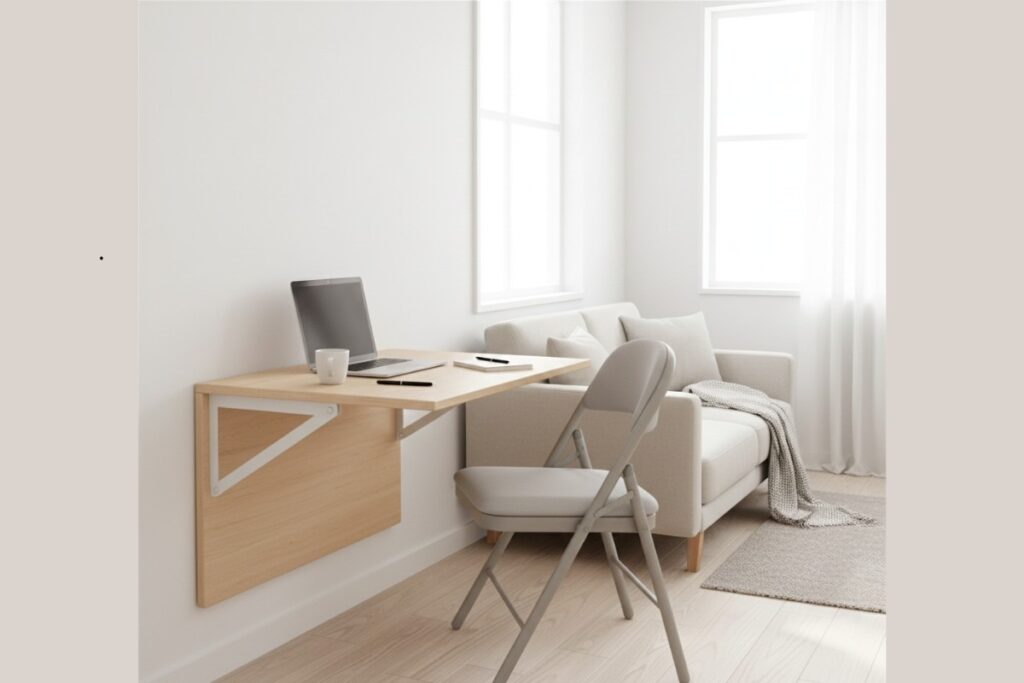Mesa dobrável transforma a sala em home office prático sem ocupar espaço fixo