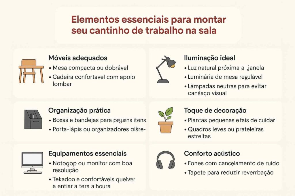 Montar um cantinho de trabalho na sala não exige reformas nem grandes investimentos. O mais importante é equilibrar conforto, organização e integração com a decoração.