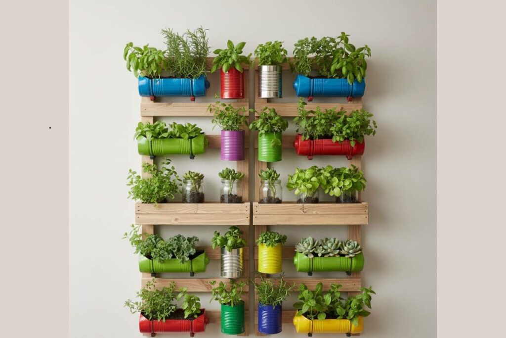 Os jardins verticais são excelentes para quem tem pouco espaço, e a versão sustentável usa materiais reaproveitados, como garrafas PET, latas, potes de vidro ou paletes de madeira.