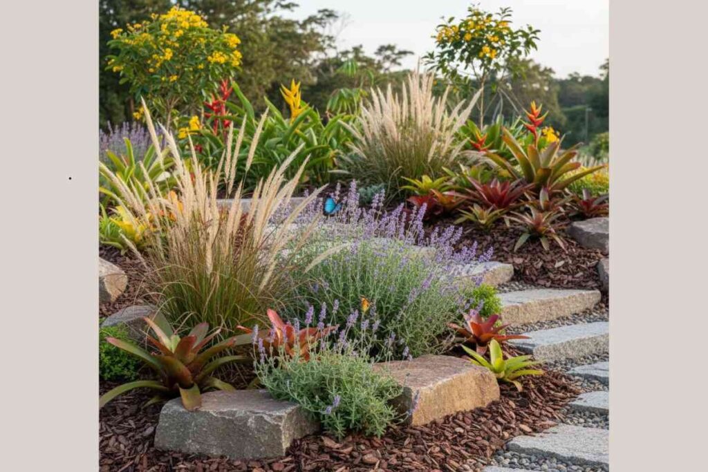 Espécies como bromélias, capins ornamentais, lavandas brasileiras, helicônias, ipês-anões e outras plantas locais mantém o jardim bonito o ano todo com mínima manutenção.