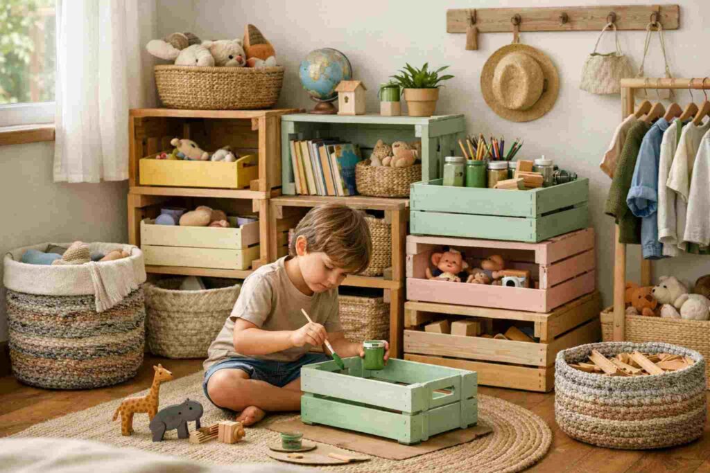 Você pode reformar móveis antigos com tinta ecológica. Caixotes de madeira viram nichos organizadores. Prateleiras simples ajudam a organizar brinquedos e livros.