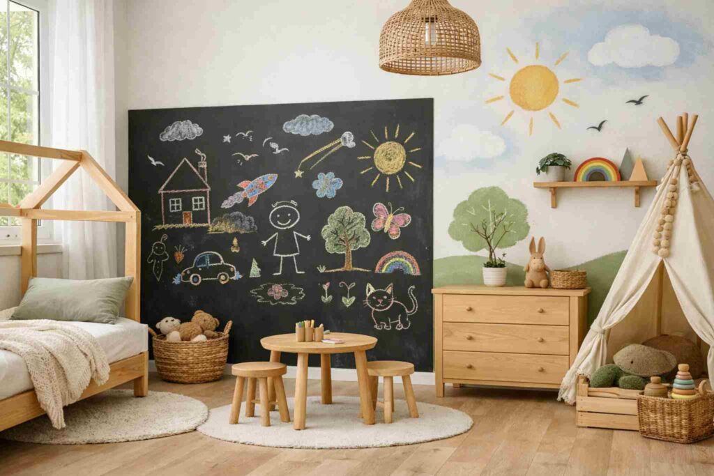 É possível criar um espaço para desenhos com tinta lousa ecológica ou delimitar uma área onde a criança possa usar giz. Isso reduz consumo excessivo de papel e transforma a parede em ferramenta criativa.