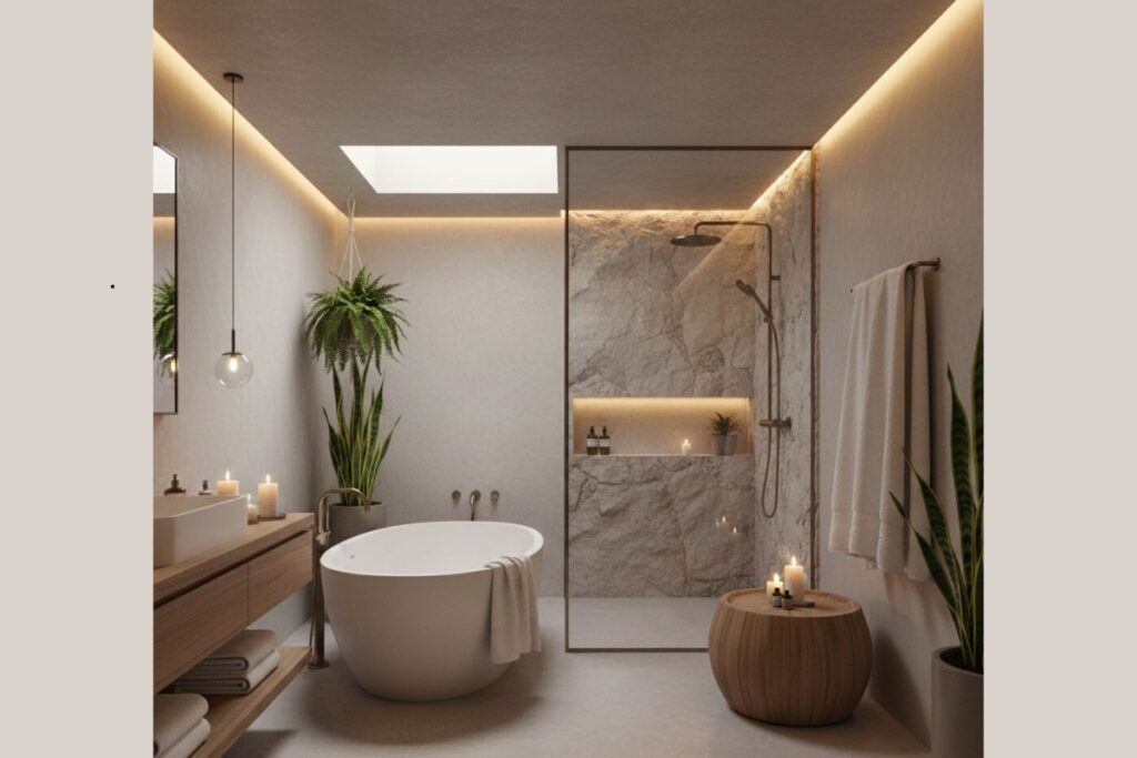 Um banheiro estilo spa cria uma atmosfera calma, com iluminação suave, aromas agradáveis e elementos naturais.