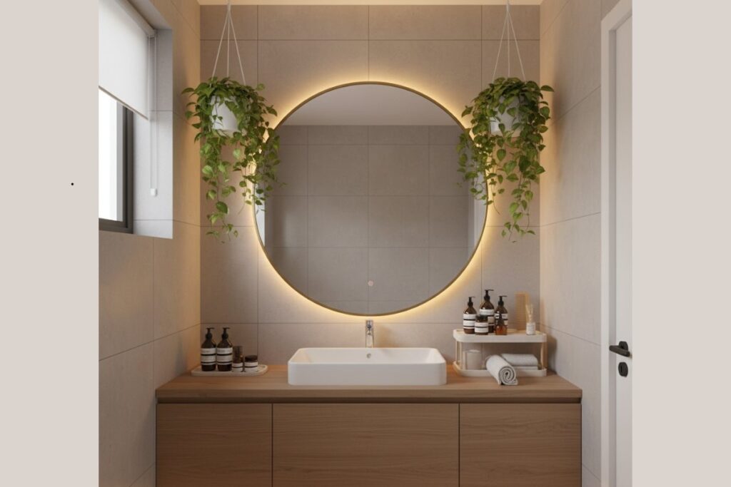 Mesmo banheiros pequenos podem se transformar. Use espelhos grandes para ampliar o ambiente, plantas suspensas e um suporte de madeira sobre a pia para organizar os produtos.