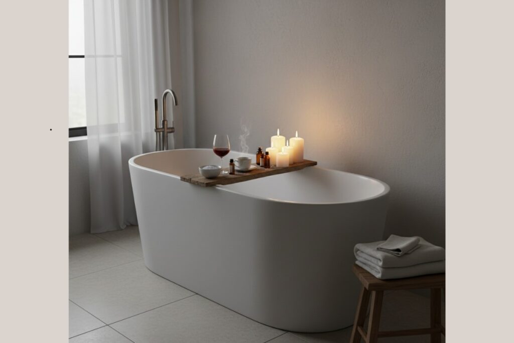 Se você tem uma banheira, adicione uma bandeja de madeira, velas, um copo de vinho ou chá e uma toalha macia por perto. A iluminação deve ser suave e os aromas bem escolhidos.
