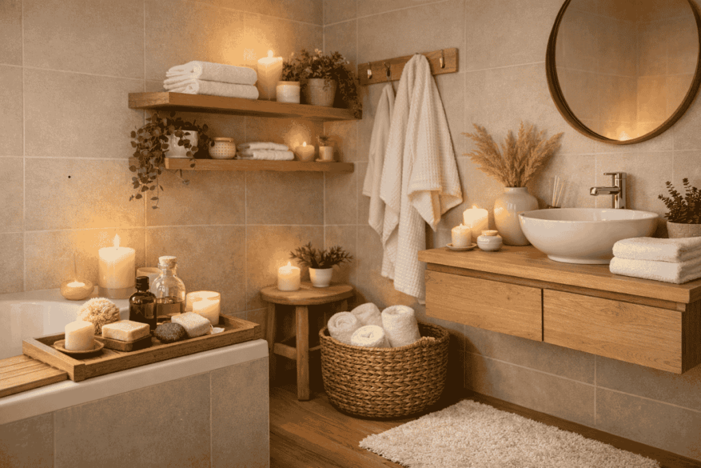 Velas aromáticas, bandejas organizadoras, difusores, plantas, iluminação quente e toalhas melhores já mudam completamente o clima do banheiro. São detalhes acessíveis que criam a mesma sensação dos spas profissionais.
