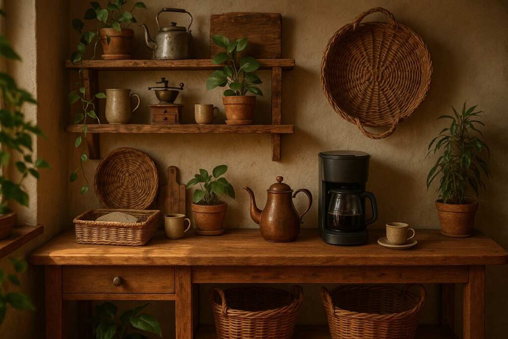 Use móveis de madeira natural, cestos de palha, plantas e utensílios vintage. Aposte em tons terrosos, quadros com moldura de madeira e uma iluminação mais quente para criar um clima aconchegante.