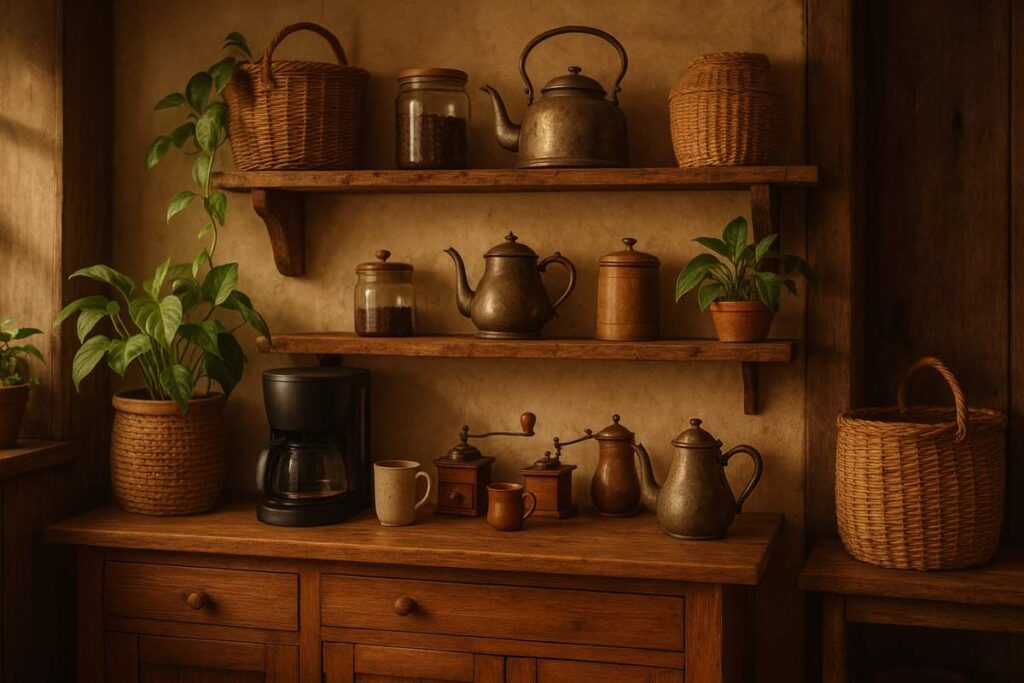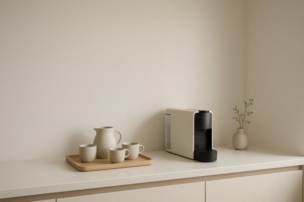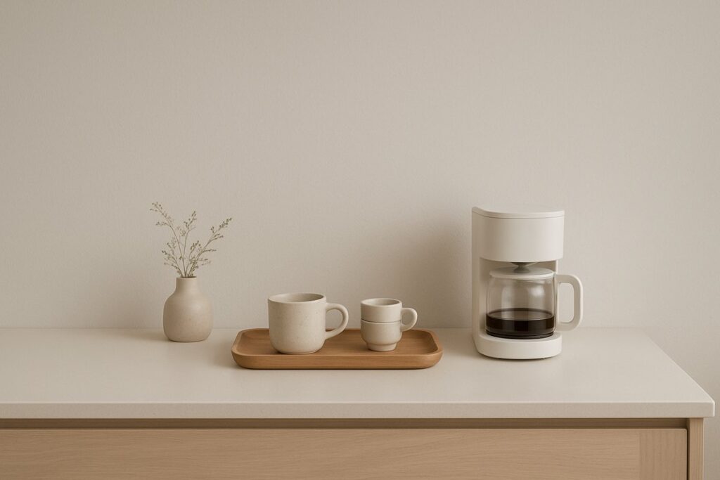 Evite excesso de objetos. Escolha apenas o que realmente será usado no dia a dia, como uma cafeteira, algumas xícaras e um recipiente para café ou cápsulas. Menos itens garantem mais leveza visual.