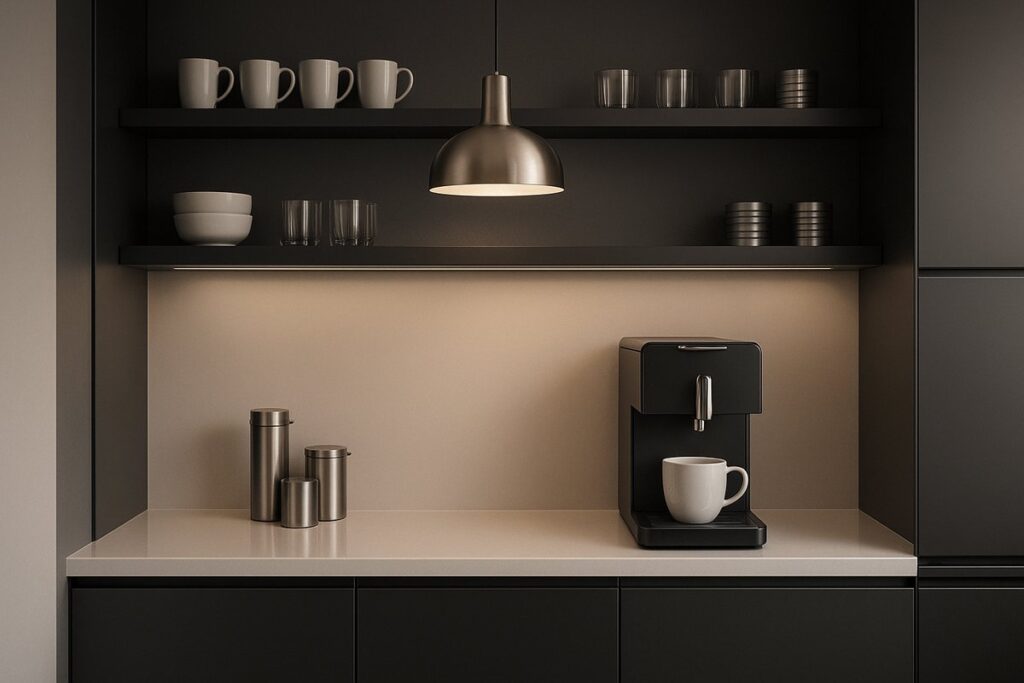 Uma das soluções mais simples é posicionar o cantinho próximo a paredes ou áreas já protegidas pela estrutura do prédio. Esse cuidado reduz a exposição direta e ajuda a manter o espaço mais seguro para cafeteiras e acessórios.