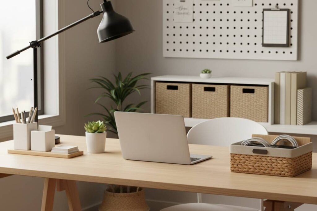 Painel organizador (pegboard): permite fixar acessórios, canecas, prendedores, agendas e pequenos objetos, liberando espaço na mesa.