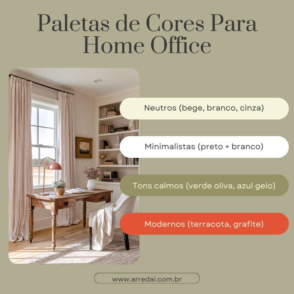 A seguir, veja um infográfico com ideias de paletas prontas para inspirar seu home office e facilitar a escolha das combinações ideais: