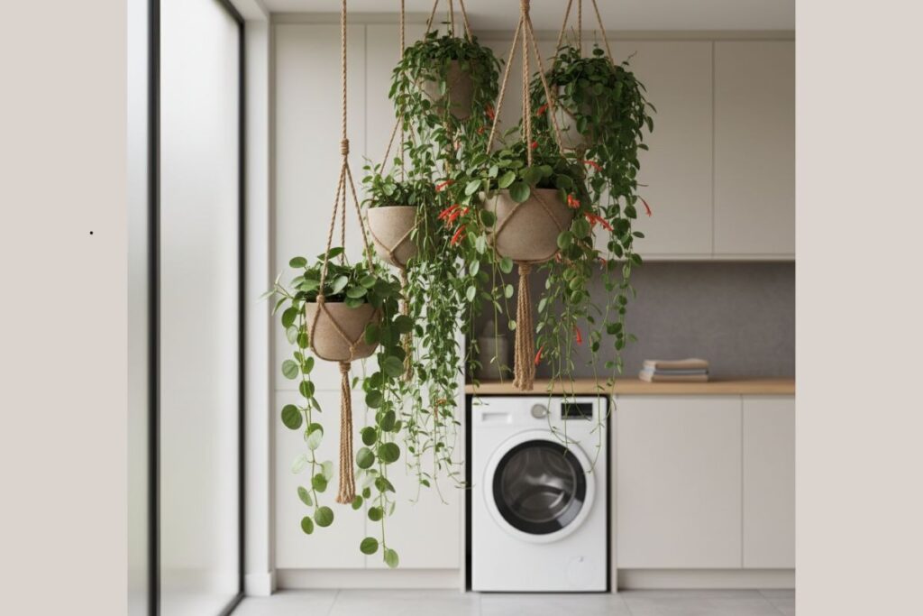 Um conjunto de vasos pendurados com corda de sisal foi instalado no teto da lavanderia. A luz indireta favorece plantas como peperômia e columéia. O resultado é um jardim leve, elegante e que não ocupa espaço no chão.