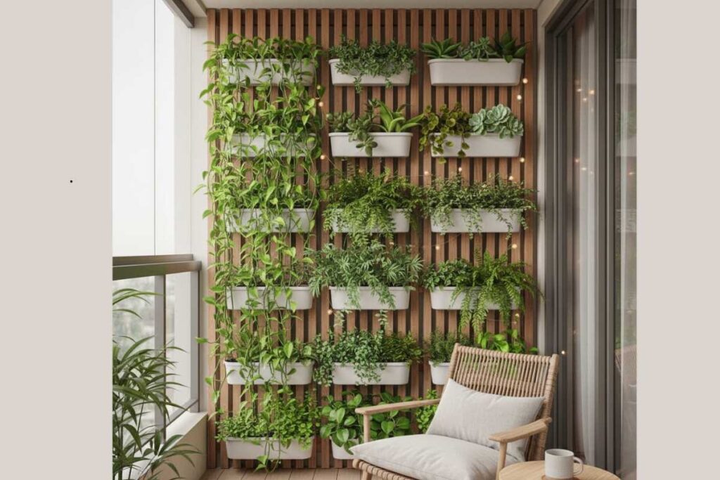 Uma moradora de um estúdio de 40m² criou um jardim vertical na varanda usando uma estrutura de madeira com vasos encaixados.