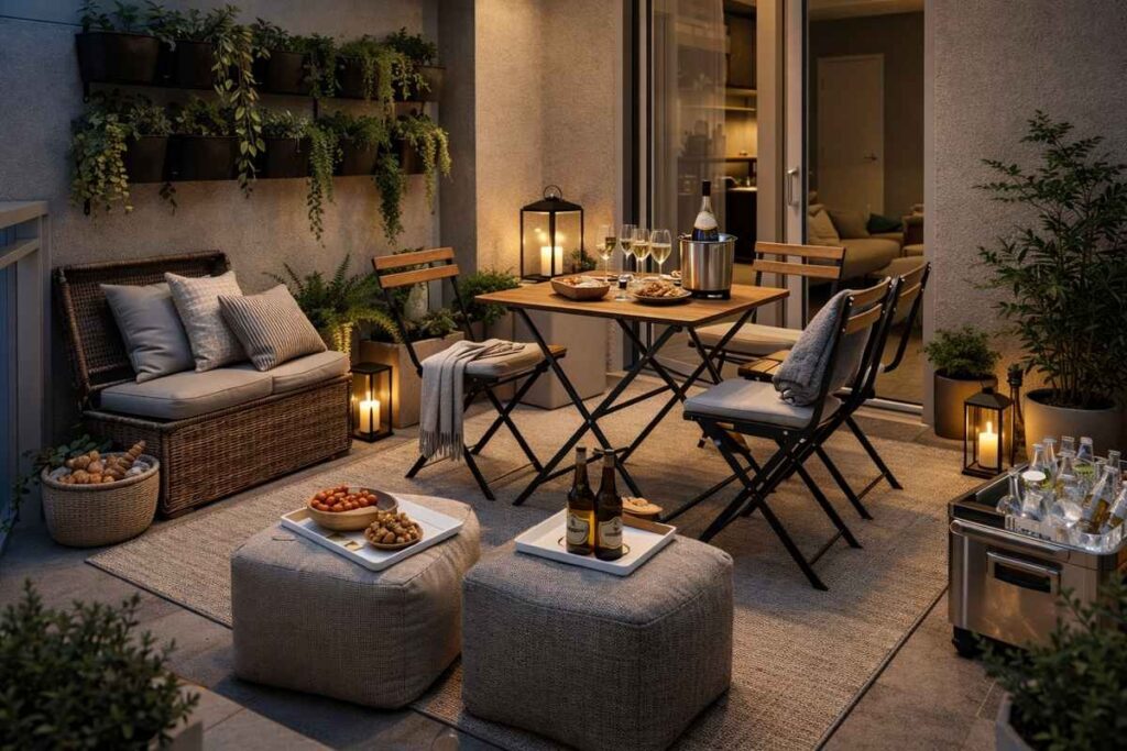Em áreas externas compactas, móveis dobráveis são grandes aliados. Após o uso, podem ser guardados facilmente, liberando espaço e mantendo o ambiente versátil.