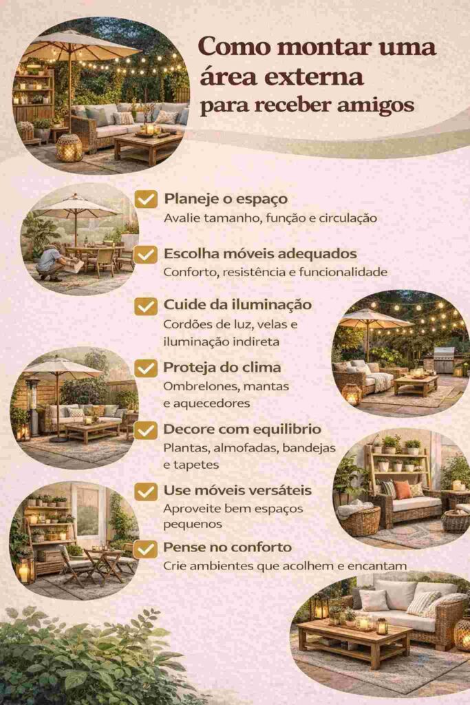 Organizar uma boa área externa para receber amigos é um investimento em qualidade de vida, lazer e bem-estar. Com atenção aos detalhes, é possível montar um ambiente bonito, funcional e acolhedor, sem precisar gastar muito.