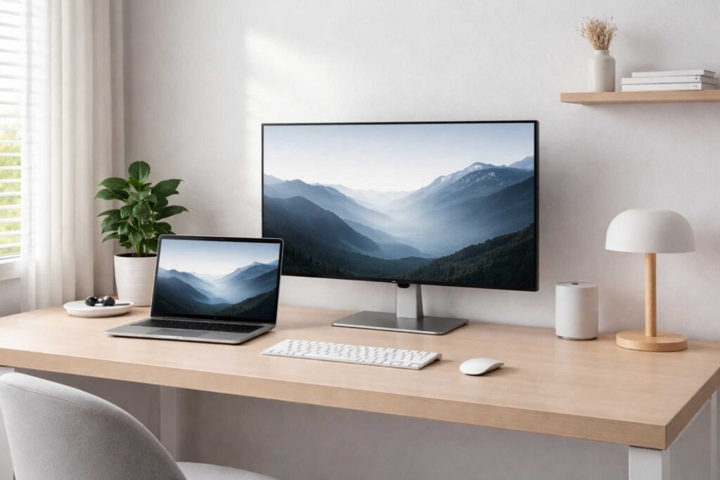 Outro ponto importante é escolher acessórios tecnológicos com design simples e cores neutras. Teclados, mouses e suportes que seguem a mesma linha visual do escritório contribuem para a harmonia do espaço.