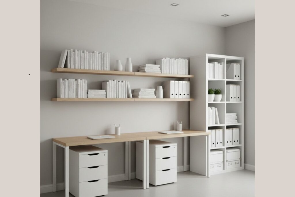 A organização é um dos pilares do escritório minimalista. Não existe ambiente clean quando a bagunça domina a mesa ou quando objetos ficam espalhados sem função.