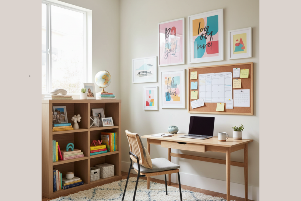 A estante com livros e objetos decorativos reflete personalidade e interesses, enquanto o mural de cortiça com metas, ideias e prazos mantém o foco nos objetivos. Esse conjunto estimula a criatividade sem comprometer a organização.