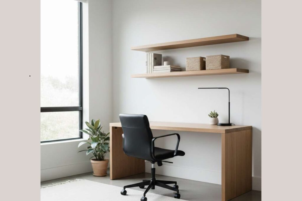 Em ambientes pequenos, a escrivaninha retrátil é uma solução prática, pois permite usar o espaço apenas quando necessário. A cadeira leve e confortável facilita a movimentação e mantém o conforto durante o uso.